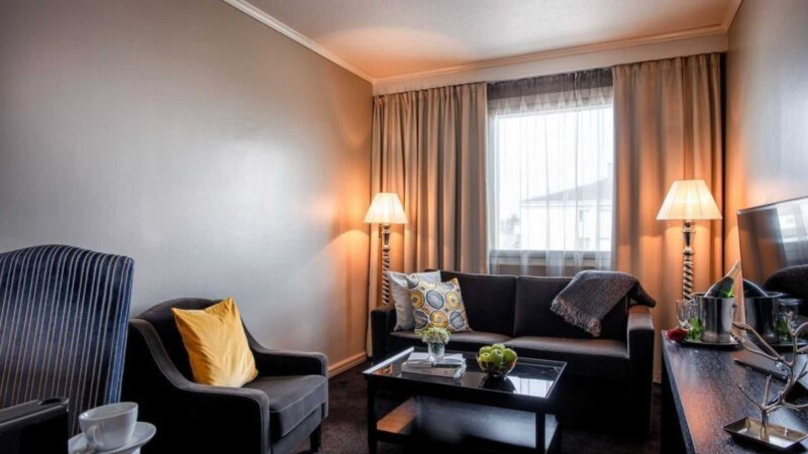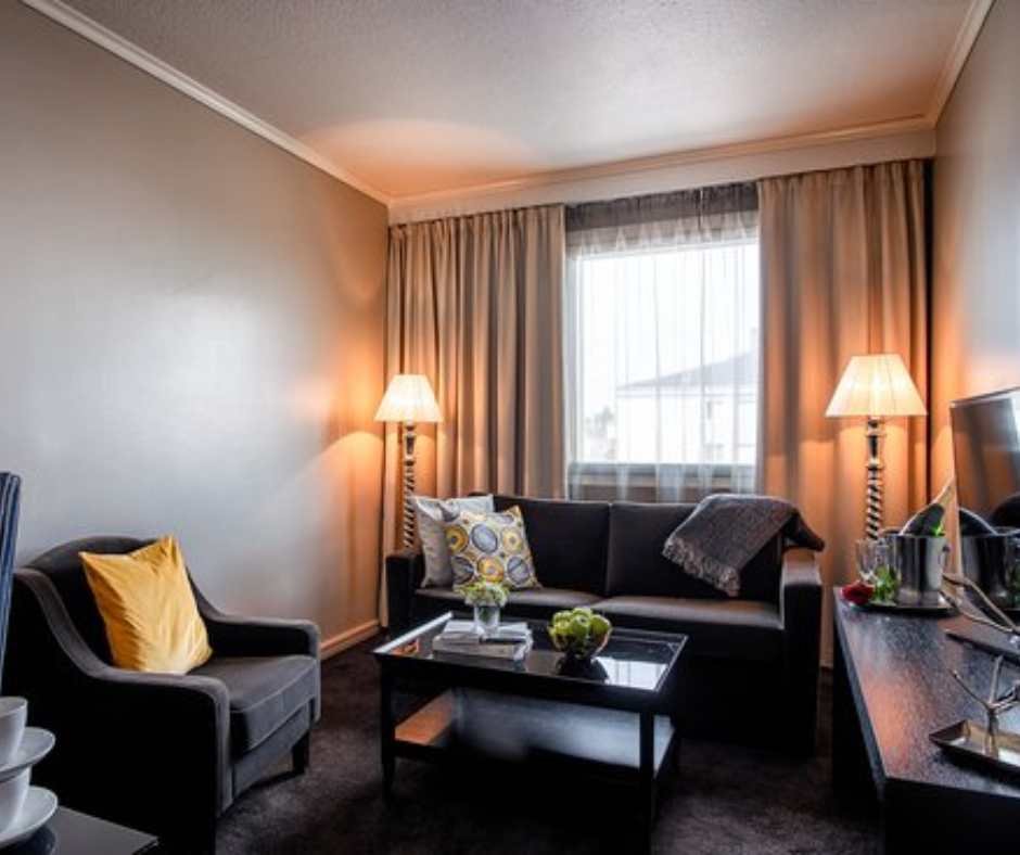 • Separate seating area with sofa, armchairs, and coffee table.