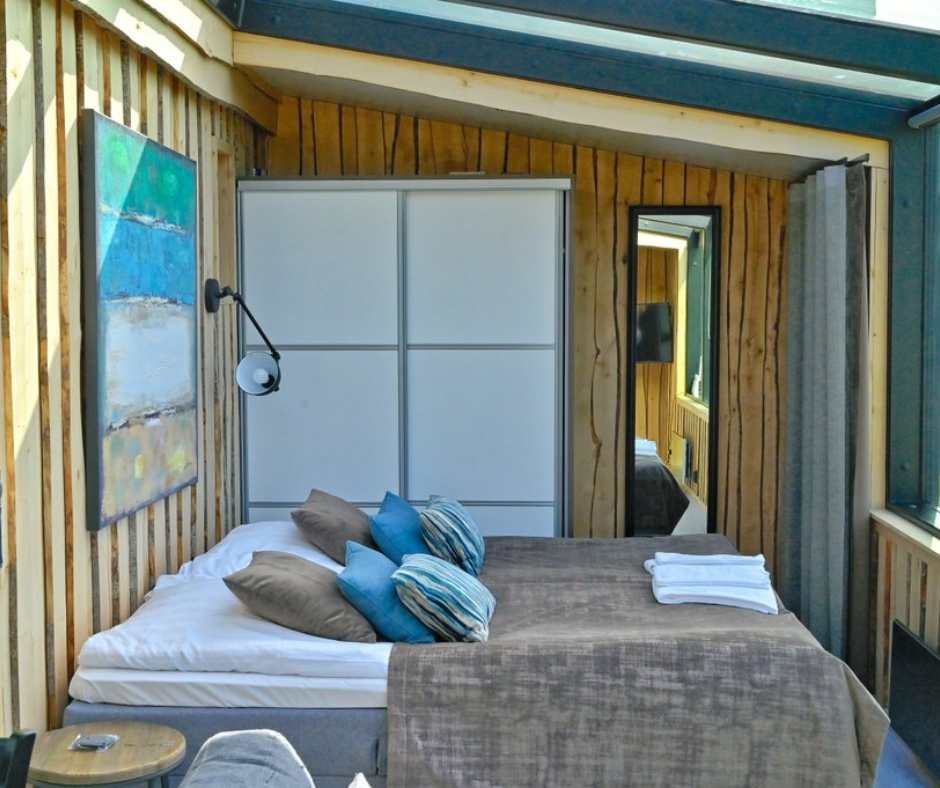 • Features a partially glass roof for stargazing and Northern Lights viewing directly from the bed.