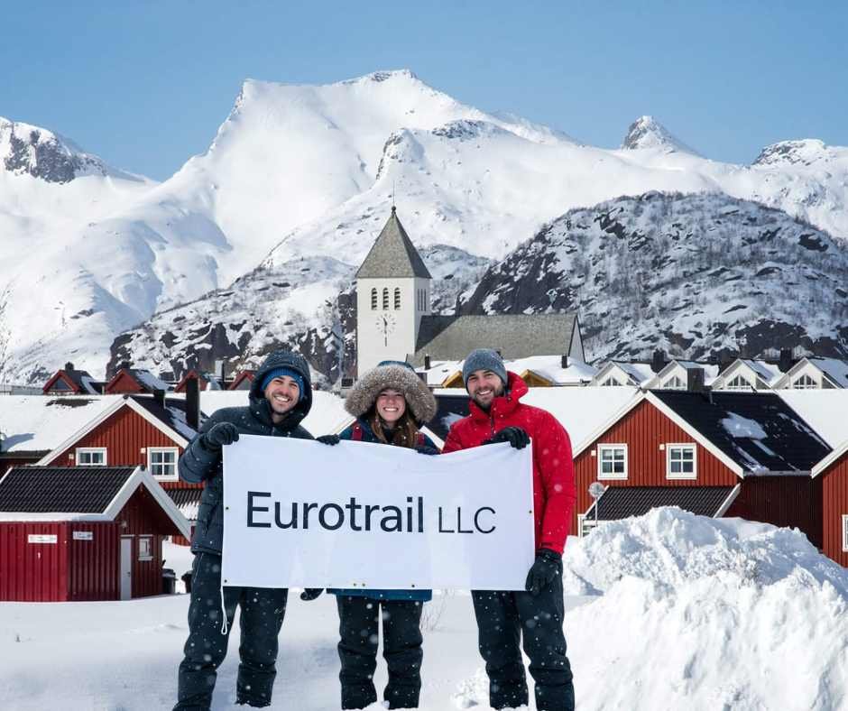 Travelers in Svolvær, Lofoten, holding an Eurotrail LLC banner with snow-covered mountains and waterfront cabins in the background during the 11D Helsinki, Saariselka, Rovaniemi, Kiruna, Narvik, Lofoten & Oslo tour.